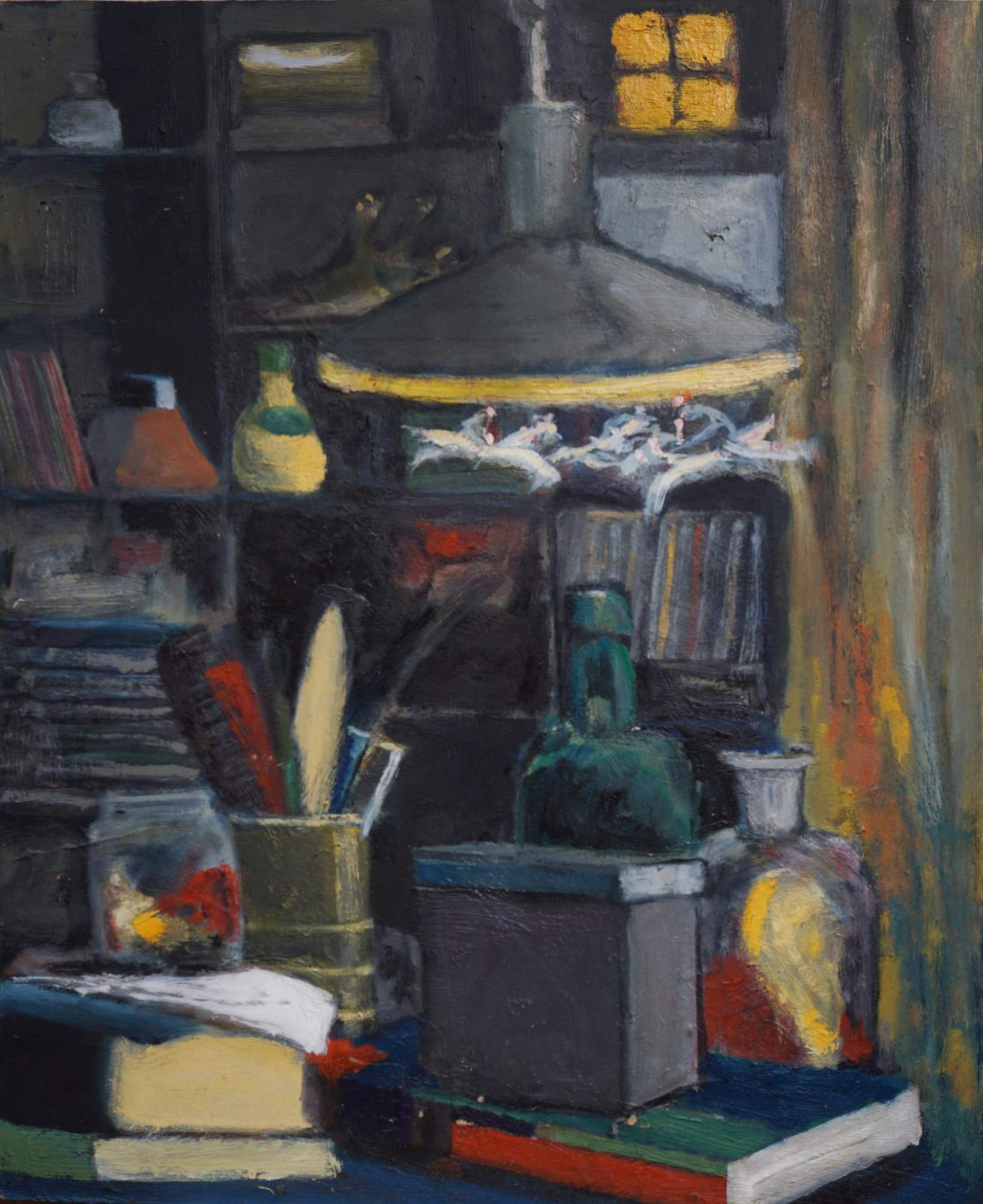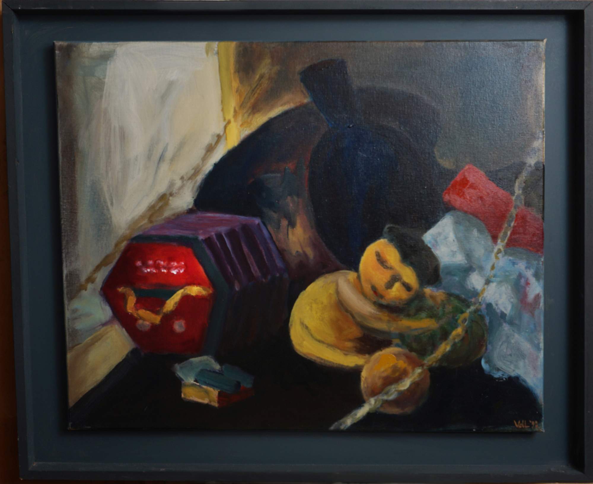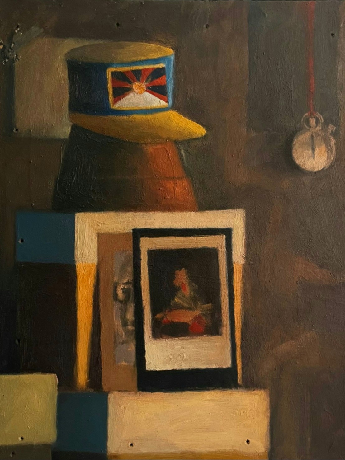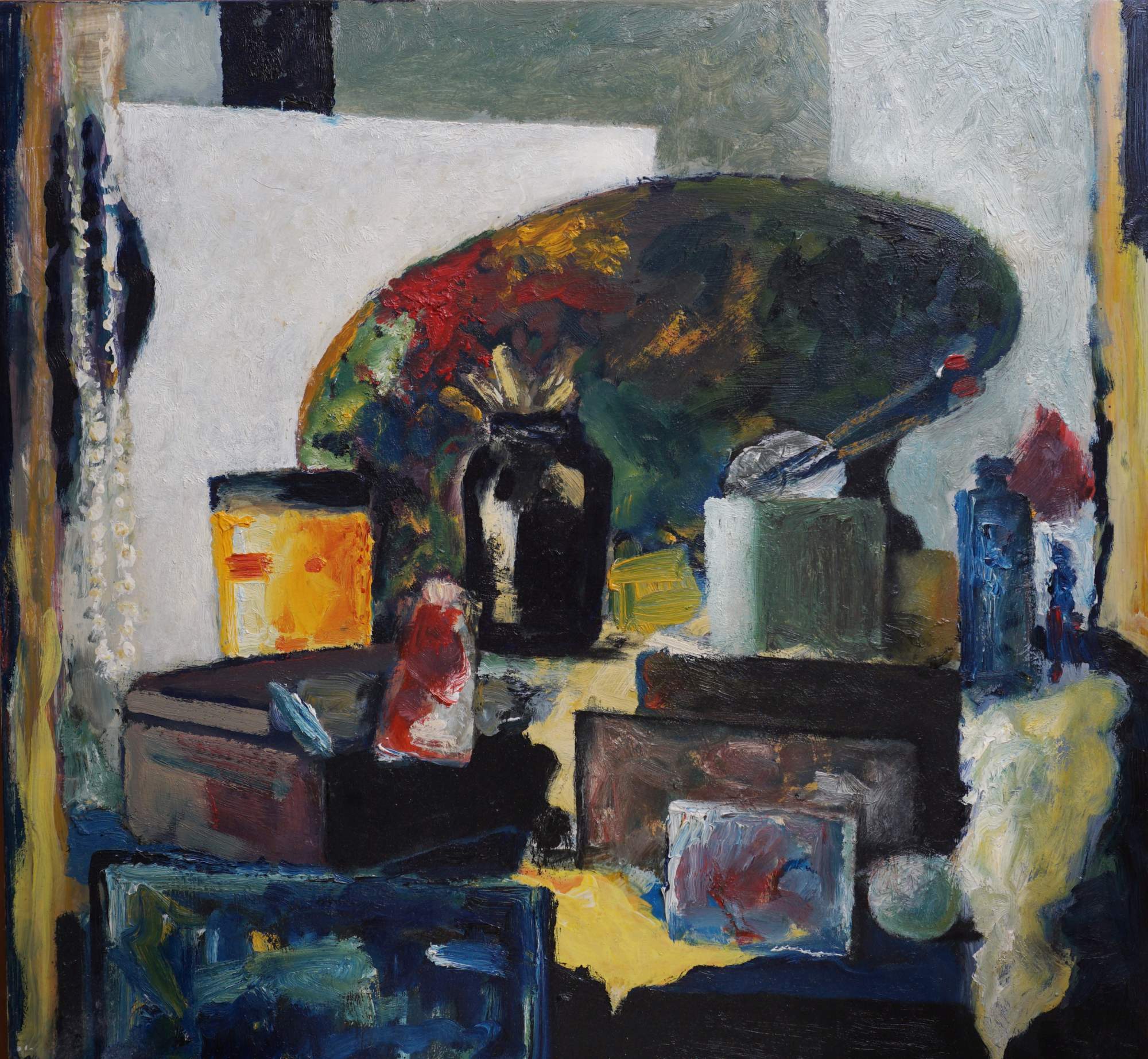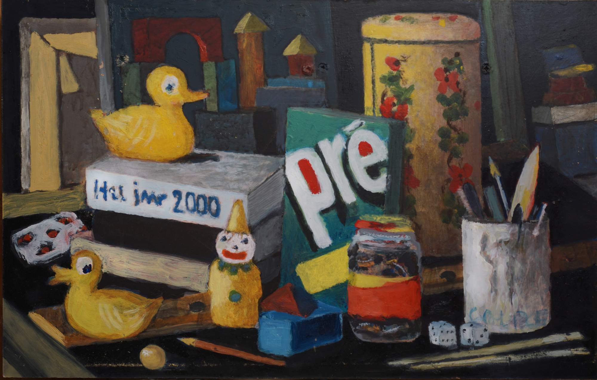 Stilleven met dozen en pet, 40x52cm, particuliere verzameling