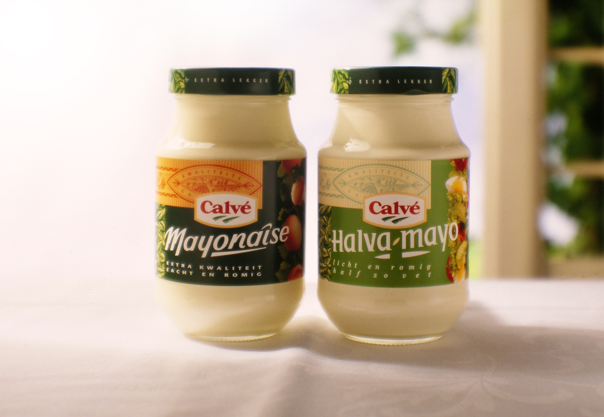 Van de tafel met de mayonaisepotten waren geen poten in beeld. Daarom kon ik de tafel suggereren door een plank wat gestapelde melkkratten* te leggen en daarop het tafelkleed te uit te spreiden. Overigens was het tafelkleed zelf niet zo meewerkend. Het kwam rechtstreeks uit de winkel en dan zit het heel strak in de verpakking met scherpe vouwen op plekken waar je ze net niet kunt gebruiken. We hebben het tafelkleed in een teil water gedaan en het daarna te drogen gehangen. We zijn het gaan strijken op het moment dat het nog klam was. Dat is het beste moment. Op de hoogste temperatuur en met een keukendoek ertussen zodat er geen schroeiplekken in konden komen.