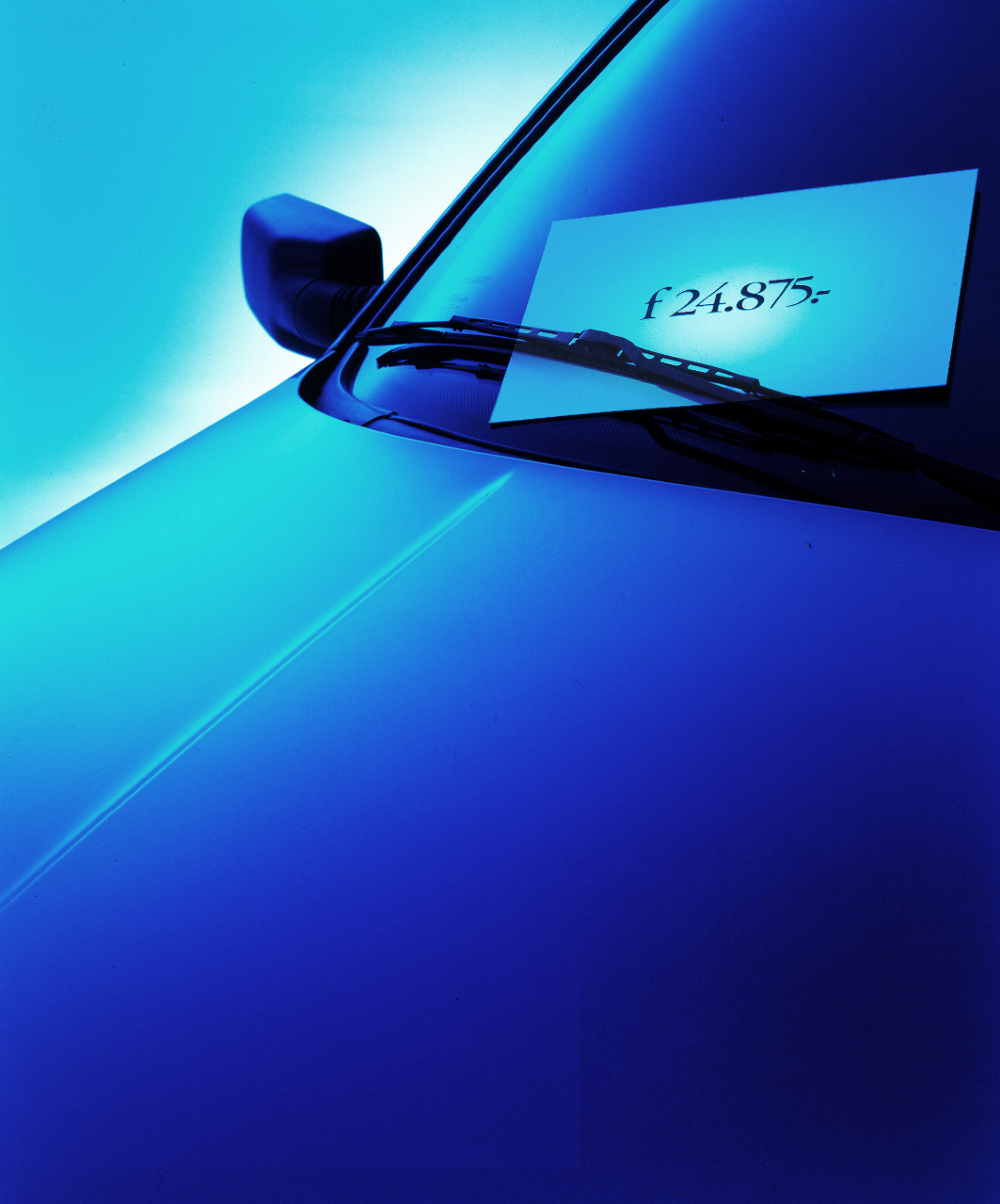 Eerlijk gezegd was deze foto zo gemaakt. Er is gebruik gemaakt van drie 5kW kunstlicht filmspots waarmee de achtergrond werd aangestraald. Dit reflecteert dan op het oppervlak van de auto en geeft een heel strak verloop op de lak. Het bord met de prijs erop (nog in guldens uiteraard) werd apart aangelicht door een minispot. Het was een heel krachtig stuk verlichting dat ik voor die gelegenheid van collega Hans Hiltermann had kunnen lenen. Als op het einde van dag 1 was de autofoto al klaar.