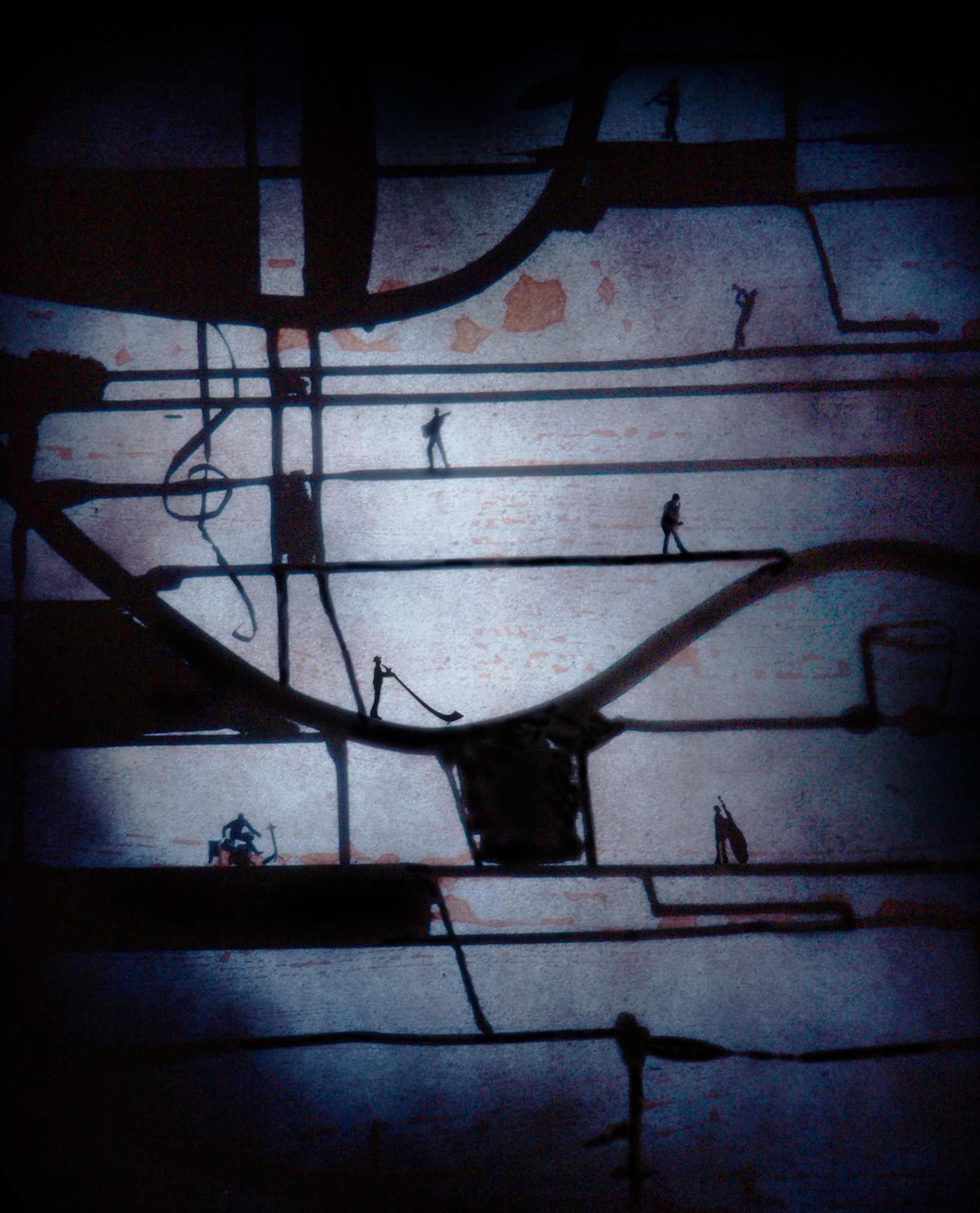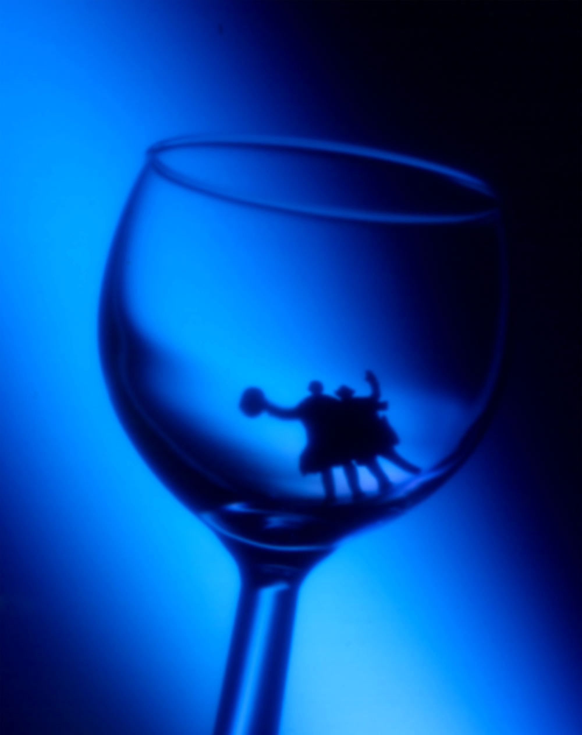 Schaal 1:20, ook wel H0 genoemd, is de schaal die gebruikt wordt voor de meeste treinbanen. De schaalaanduiding staat voor een verkleiningsfactor die wordt toegepast. Bij een schaal van 1:20 (1 op 20) wil dat zeggen dat 1 meter van het model overeenkomt met 20 meter in de werkelijkheid. Ik weet niet meer precies hoe ik er aan gekomen ben maar op een dag had ik drie dronken mannen in mijn studio. Op schaal 1:20 dan. Ik heb de dronken mannen in een wijnglas gezet en onder een mooi blauw licht gefotografeerd. De foto bleek achteraf het startsein voor vele commerciële opdrachten en vrije exercities.