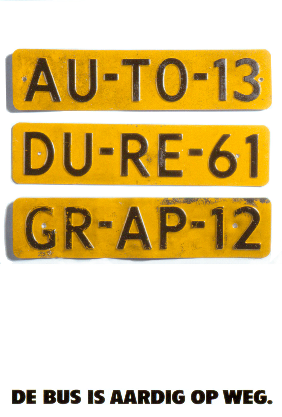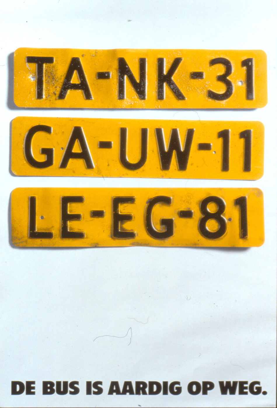 De eerste campagne was gebaseerd op Nederlandse kentekenplaten. Daarbij werden steeds drie fictieve kentekenplaten onder elkaar getoond die samen een zin vormen. "Auto Dure Grap", "Tank Gauw Leeg" et cetera. Het budget was beperkt waardoor eigenlijk maar twee posters konden worden uitgevoerd. Kessels bedacht dat naast het budget ook de te gebruiken drukkleuren beperkt waren. Nummerplaten bestaan uit maar twee kleuren, geel en zwart. Door de campagne in twee kleuren te laten drukken ontstond financiële ruimte om toch vier versies van de posters te maken. Een briljante vondst.